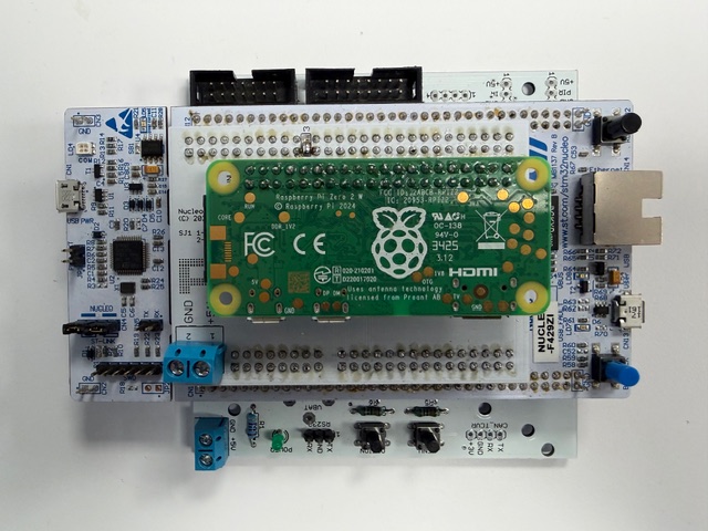 Picture of the STM32F429 Nucleo-144 board with V4 shield and DC-DC converter PCB